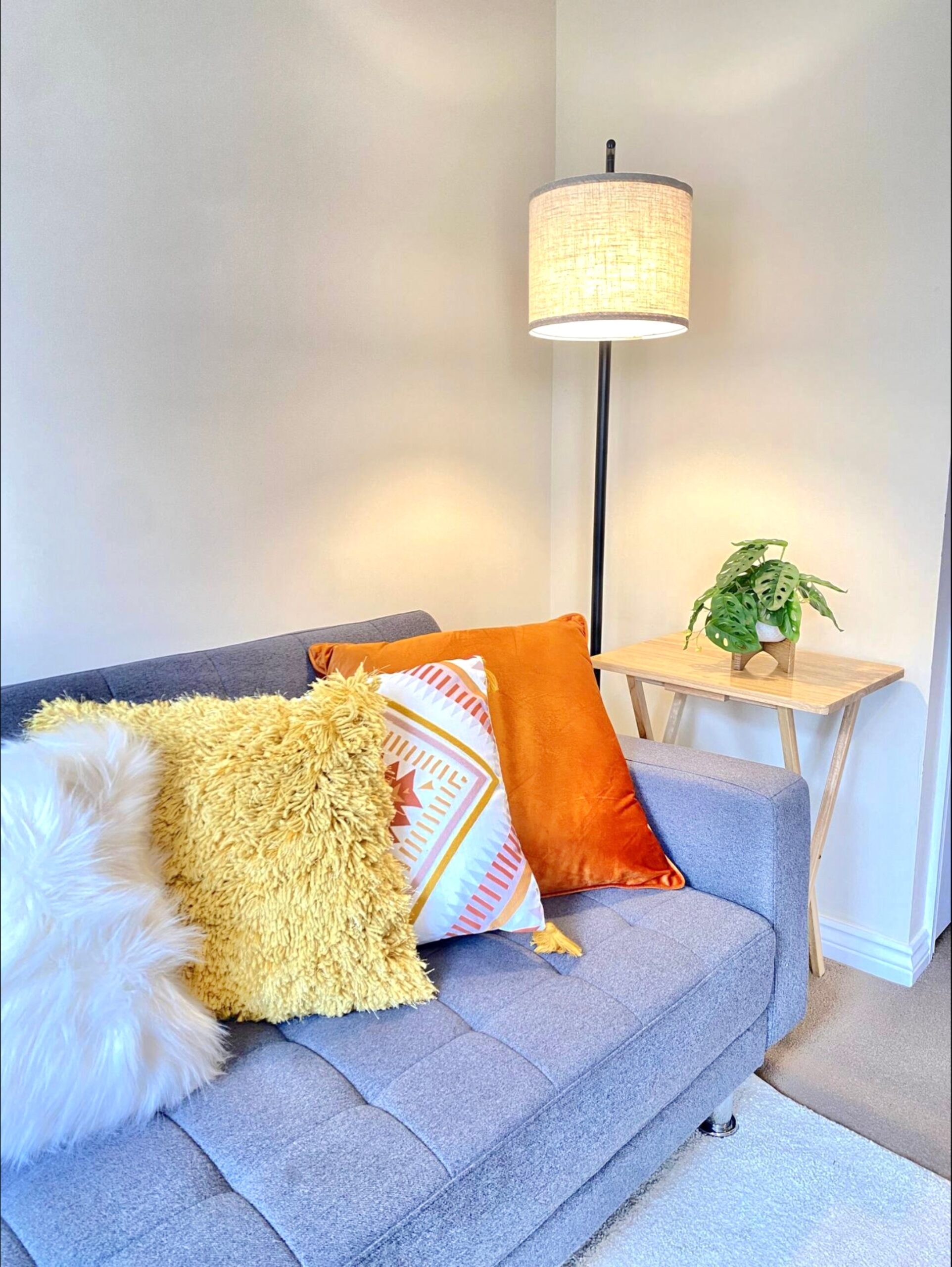 There’s a comfortable L-shaped sofa which has lots of snuggly cushions and blankets.